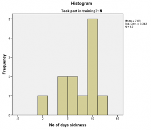First, it is evident that the employees who did not participate in the training program were generally absent for more days than those who attended the program. This is evidenced by the fact that the former have a mean of 7.08 days while the latter have a mean of 3.33 days. Moreover, the histogram for those employees who did not participate in the program is skewed to the right, which suggests that most of them were absent from work for more than 7 days. On the other end of the spectrum, the histogram for those who participated in the program is skewed to the left, which implies that most of them were absent for less than 3 days. On the bottom line, it is highly likely that employees who participate in the program are absent from work due to less serious illnesses or minor injuries because most of them are only absent for a few days.