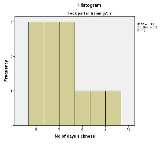 First, it is evident that the employees who did not participate in the training program were generally absent for more days than those who attended the program. This is evidenced by the fact that the former have a mean of 7.08 days while the latter have a mean of 3.33 days. Moreover, the histogram for those employees who did not participate in the program is skewed to the right, which suggests that most of them were absent from work for more than 7 days. On the other end of the spectrum, the histogram for those who participated in the program is skewed to the left, which implies that most of them were absent for less than 3 days. On the bottom line, it is highly likely that employees who participate in the program are absent from work due to less serious illnesses or minor injuries because most of them are only absent for a few days.