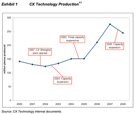 CX Technology’s strong performance in this market facilitated further growth. The company opened production plants in Ho Chi Minh City, Vietnam (CX-Vietnam) and Shanghai, China (CX-Shanghai) in 1996 and 2002, respectively, to accommodate new business. Because of its high volume and end applications in automotive and consumer electronics, the company had invested in acquiring ISO 14001 and ISO/TS 16949 certification and a fully implemented ERP system. Between 2002 and 2008, CX Technology had consistently invested in new capacity in both plants, growing production from nearly 142 million pieces in 2000 to more than 245 million in 2008 (Exhibit 1). By the start of 2009, CX Technology had over 1,300 employees and 140,000 square meters of manufacturing floor space.
