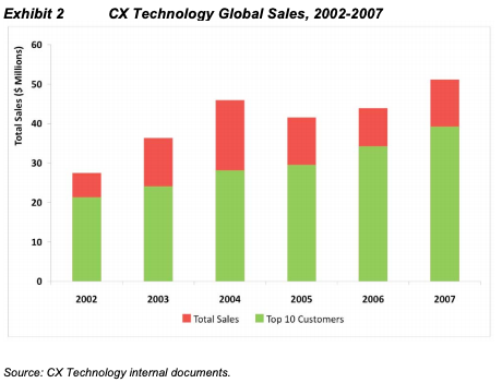 As a critical link in the supply chain of many of its customers, CX Technology’s ability to deliver products up to specification on time earned the firm significant recognition over the years. Among its customers, CX Technology was reputed for its reliability and high quality products. In fact, the majority of its sales revenues came from repeat business. Additionally, CX Technology was able to leverage its impressive roster of customers to gain additional customers in an industry where a proven track record of success was vital.