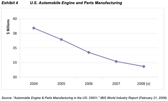 But to many observers in 2009, the future of the automotive industry looked bleak, if not catastrophic. In the United States, for decades the center of the automotive world, growth had reached a plateau, volumes had stagnated, and the major manufacturers faced bankruptcy. Among U.S. manufacturers of engines and parts – CX Technology’s potential customers and competitors – revenue had fallen by more than 17% over the past four years (Exhibit 4) and consolidation was rampant. Elsewhere car production was up but competition fierce, particularly among the suppliers popping up like mushrooms wherever labor was cheap. Any firm seeking to enter as a new Tier 2 supplier would be walking into a maelstrom, if not a minefield.