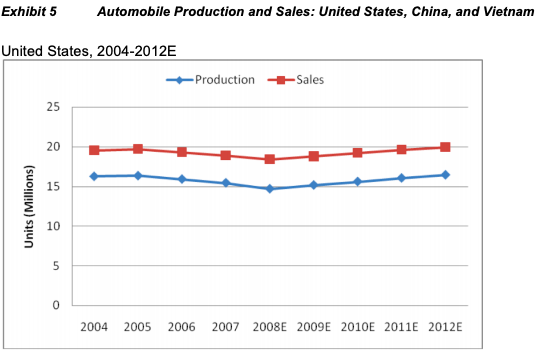 The recession of 2008-09 had created a precarious situation for both U.S. automotive manufacturers Ford, General Motors, and Chrysler (also known as the “Big Three”) and U.S.-based foreign manufacturers such as Toyota and Honda. Declining consumer demand and increasing sensitivity to rising gas prices had resulted in a significant decline of new vehicle purchases, though stabilization was expected by 2012. (See Exhibit 5 for production and sales projections for the United States, China, and Vietnam.) It wasn’t clear that the Big Three would survive that long, however, as they had approached the U.S. government in late 2008 for financial support totaling US$34 billion.6 Suppliers, too, were feeling the crunch with a similar reduction in engine and parts manufacturing revenues from US$38.3 billion in 2004 to US$31.8 billion in 2008. This resulted in dramatic consolidation, through bankruptcies and mergers, of both manufacturers and suppliers as profits disappeared and financial markets dried up.