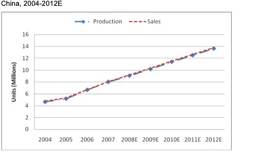 Automobile production in China was forecasted to grow from 4.6 million units in 2004 to 13.6 million in 2012, a 14.4% CAGR. Leading domestic manufacturers, including ChinaFirst Automobile Group, Dongfeng Motor Corp, and Shanghai Automotive Industry Group Corp, commanded the largest portion of the local markets with 28.7% of sales volume. In 2006, China surpassed Germany to become the third largest automobile maker in the world behind the United States and Japan.