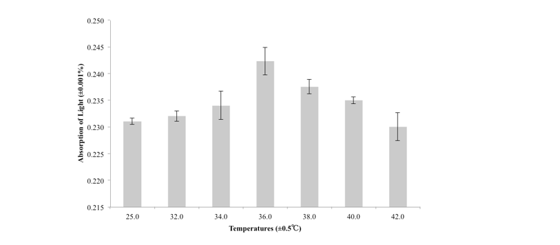 “Table 1: The average absorption of light at 565nm for all temperatures.”